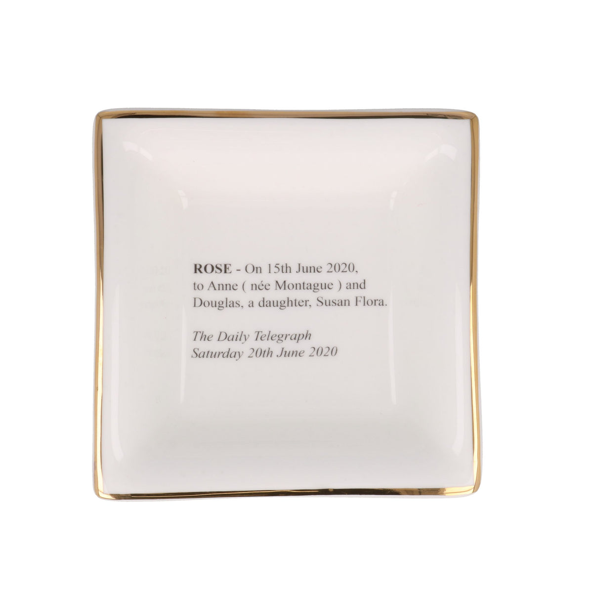 This small dish personalised is a beautiful gift for new parents or Christenings.  For Telegraph announcements please send hello@noblemacmillan.com the online reference and date of publicity. For Times announcement please email us a scan plus the date on inclusion or send a physical copy to our store. You will be emailed artwork for approval, the lead time is 21 days from art work approval. We will be in touch after purchase for font options and colour of rim.