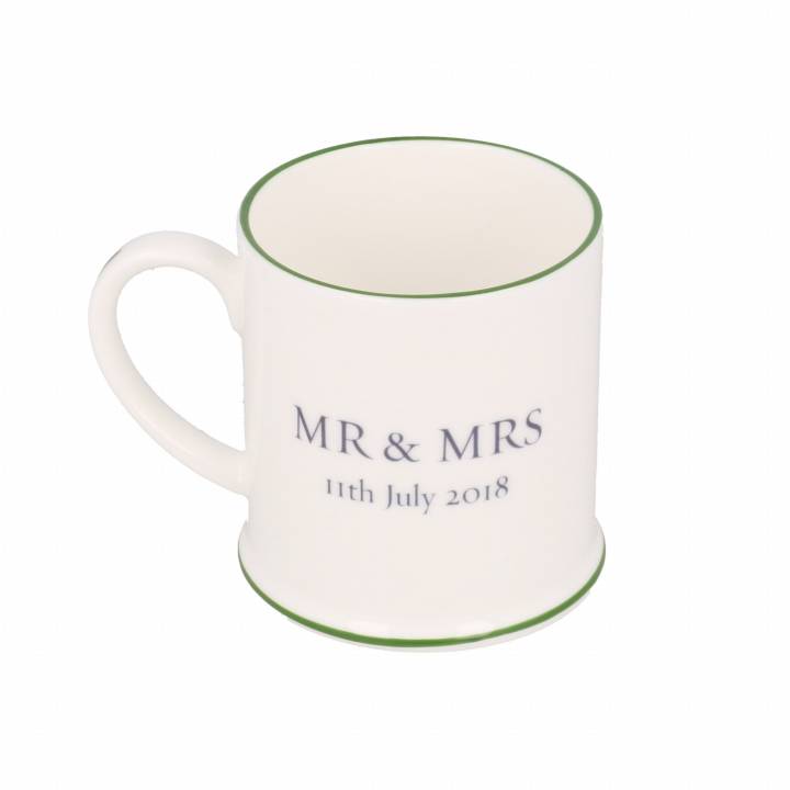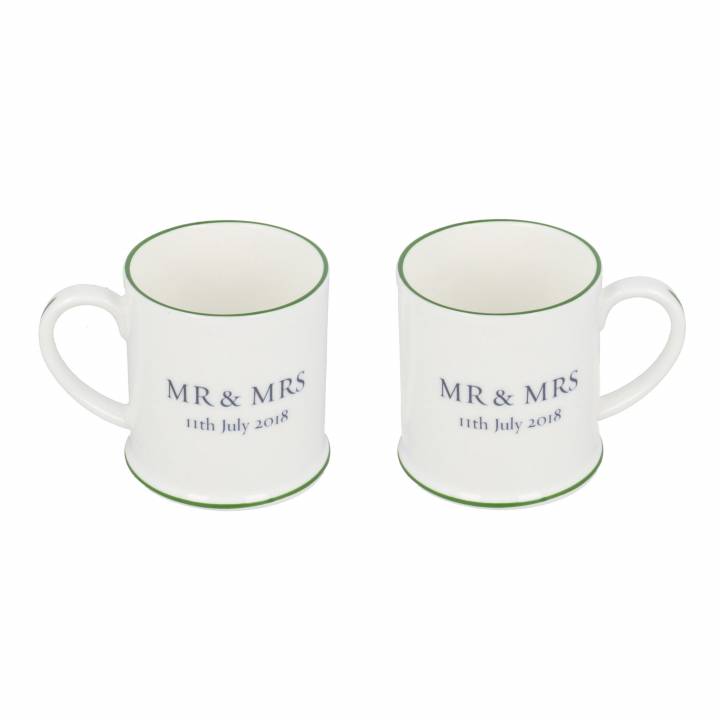 A pair of Mr and Mrs’s espresso coffee mugs which can be personalised with the date of the wedding. They are made in England, and hand painted with a green rim at the top and bottom.