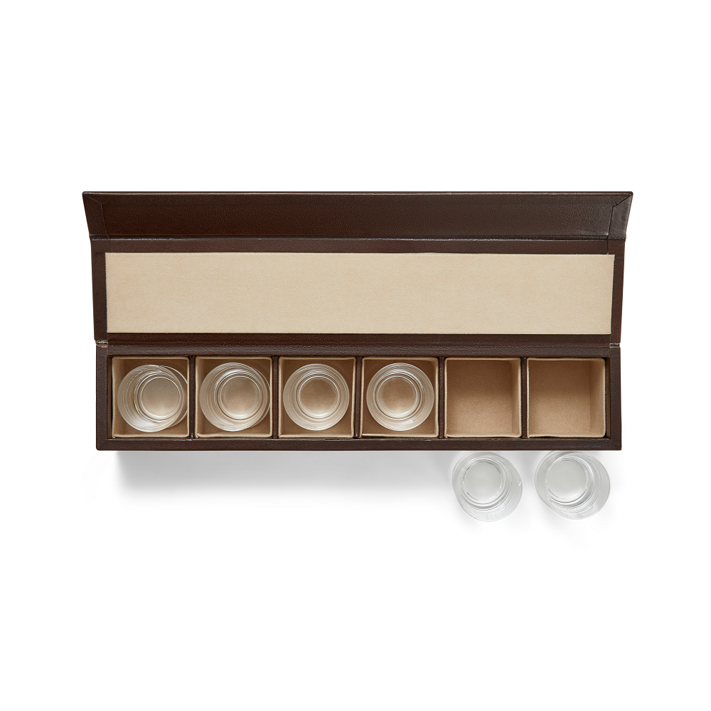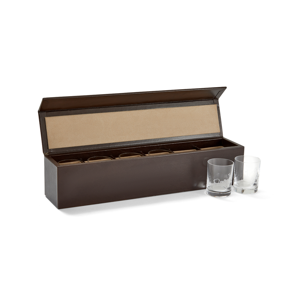 A seamless combination of glass and leather, this set of 6 shot glasses and their gorgeous leather box with suede lining is the ultimate fun, unique and eye-catching gift. Whatever the occasion, embellish this already one-of-kind gift with engraving on the lid, perhaps a name, date, or place - ready to open to your pre-etched glasses and see who gets which of the following wild phrases: Down It! Slam it! Thirsty Girl! Shot! Party! Cheers!