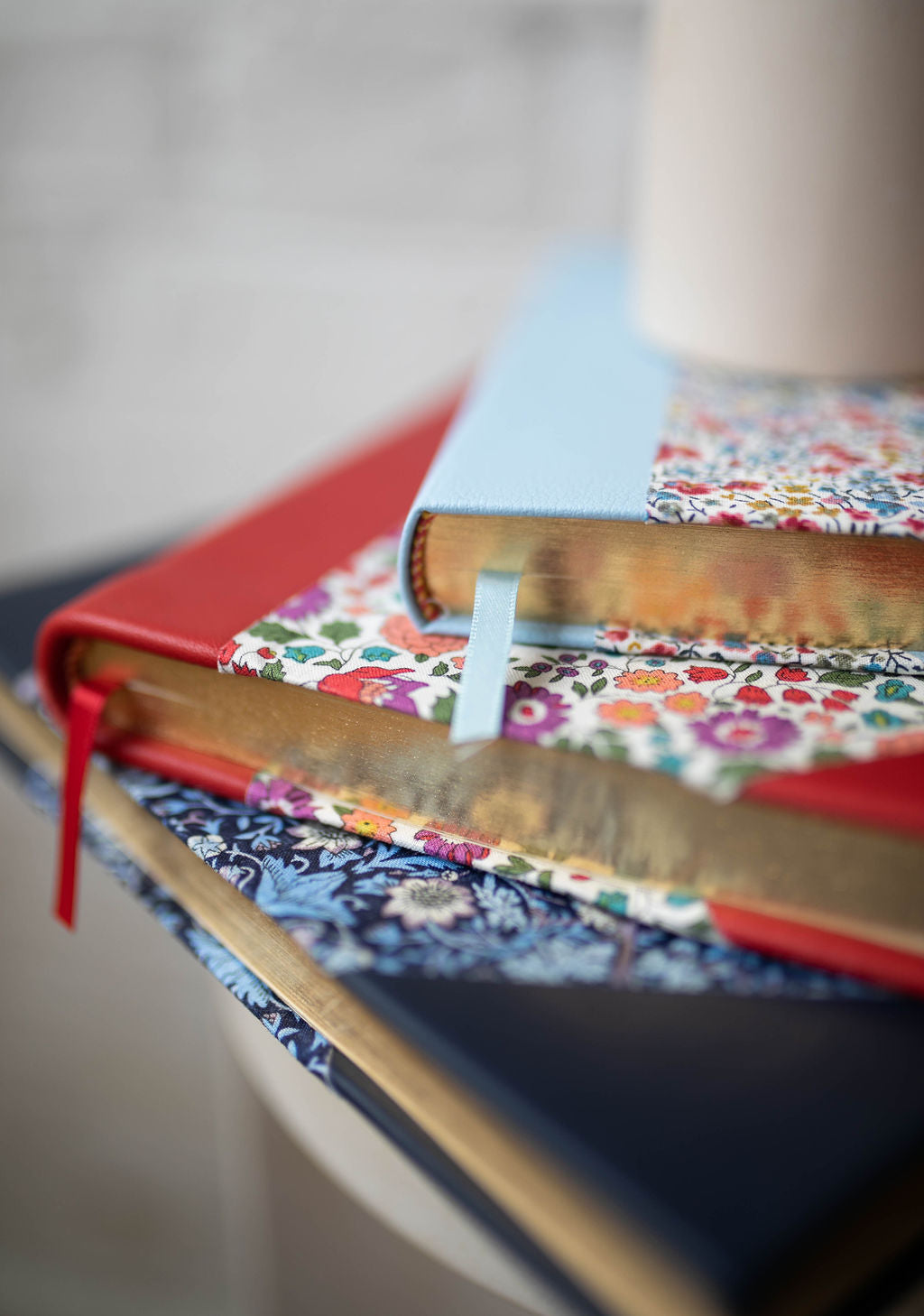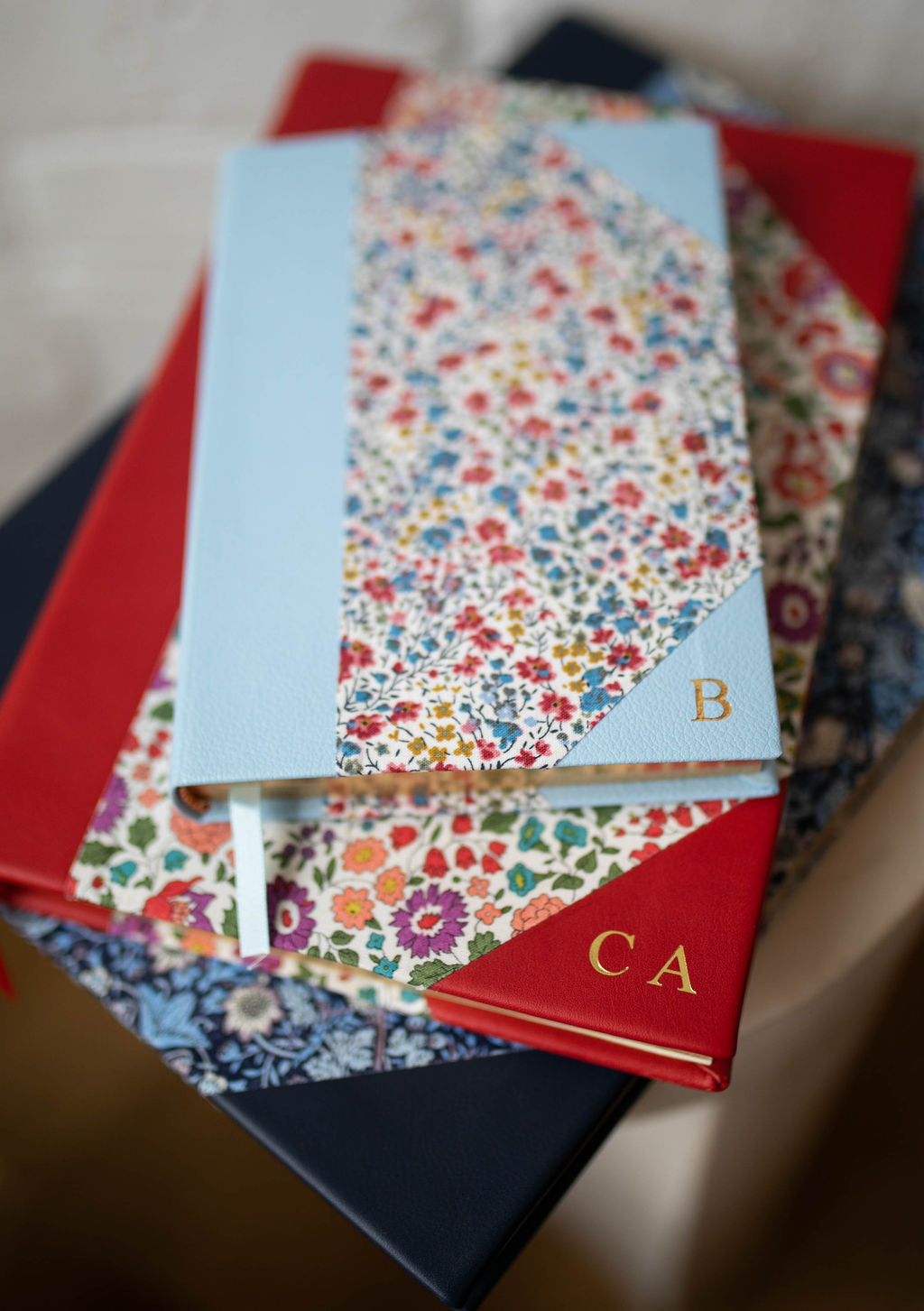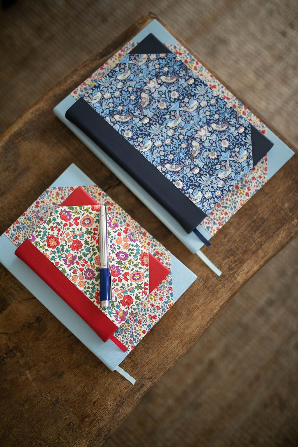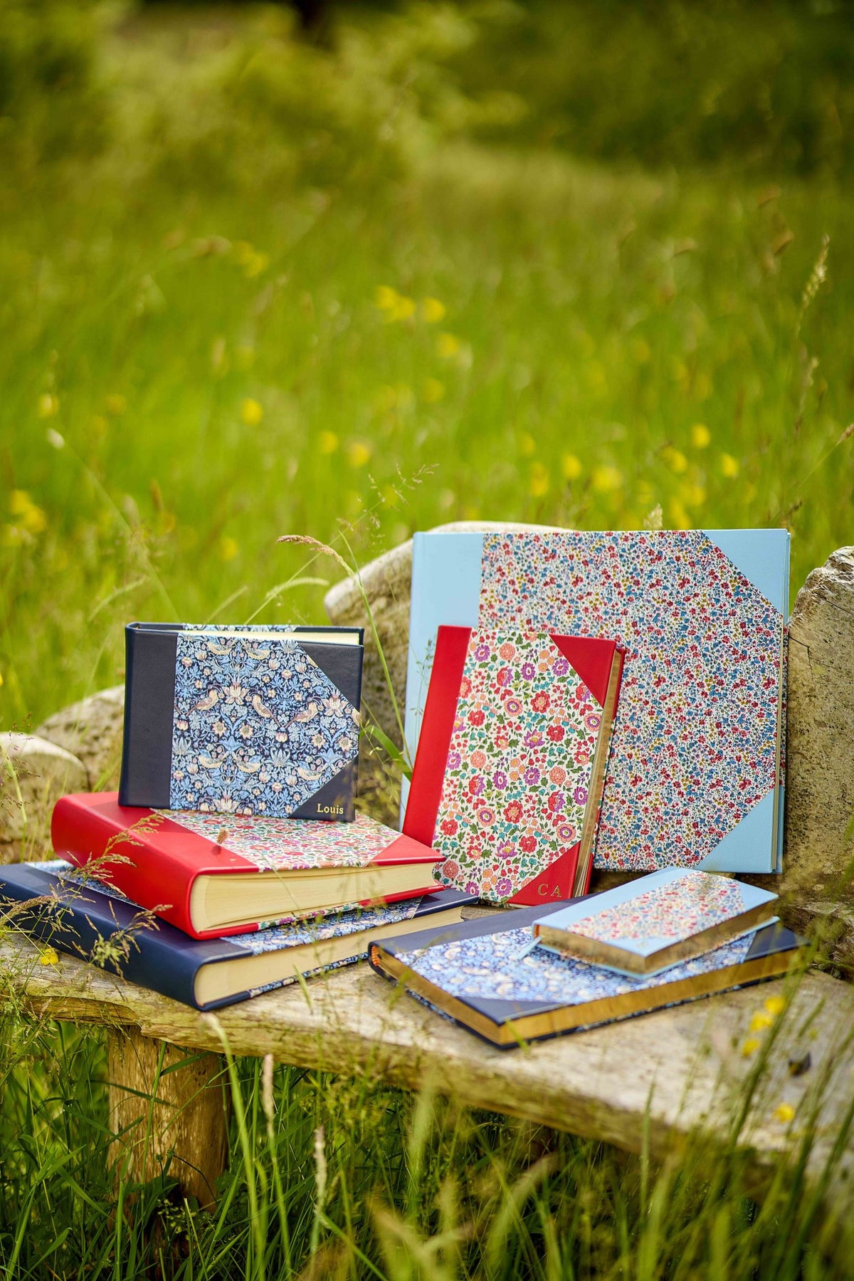 We are so excited to share with you our newest range made with Liberty Fabrics. From Journals to Scrap Books, each design is hand made in our London workshop. The three Liberty Fabrics we have used for this range are Phoebe Augusta, D’anjo Augusta and Strawberry Thief. Each have been paired with a matching leather, to make a beautiful half bound album or journal. Each can be engraved on the leather part of the product.