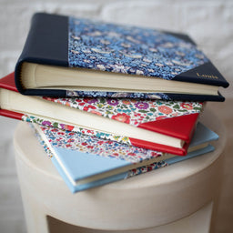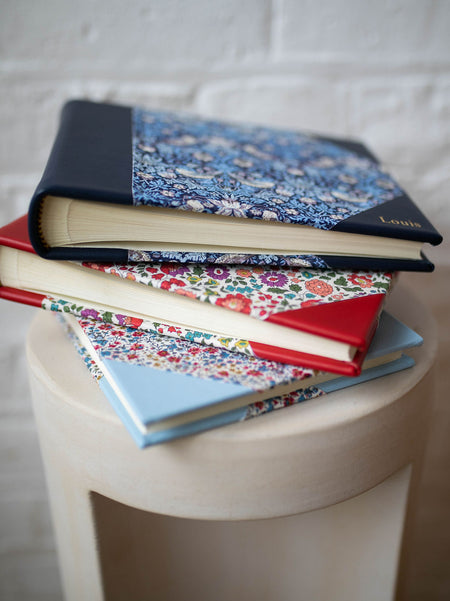 We are so excited to share with you our newest range made with Liberty Fabrics. From Journals to Scrap Books, each design is hand made in our London workshop. The three Liberty Fabrics we have used for this range are Phoebe , D’anjo and Strawberry Thief. Each have been paired with a matching leather, to make a beautiful half bound album or journal.